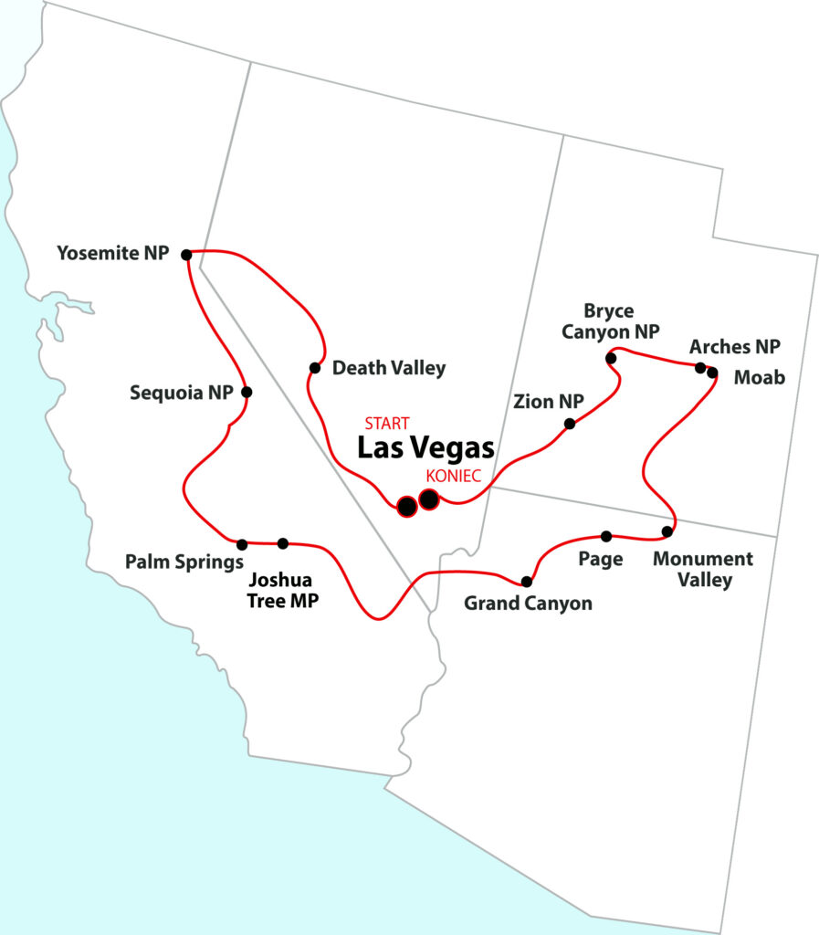 PROGRAM WYCIECZKI: Zobaczymy między innymi: Las Vegas, Zion National Park i Bryce Canyon National Park. Na dłużej zatrzymamy się w miejscowości Moab w Utah. Odwiedzimy znajdujące się w sąsiedztwie trzy niezwykłe parki; Arches National Park, Canyonland National Park i Death Horse State Park. W Monument Valley spotkamy się z przewodnikiem z plemienia Navajo, który zawiezie nas w najciekawsze miejsca doliny. W drodze do malowniczego jeziora Powell zatrzymamy się przy tamie Glen Canyon. W Page zobaczymy występ zespołu folklorystycznego Indian Navajo. W kolejny dzień wycieczki odwiedzimy cud natury – Grand Canyon. Przejedziemy potem legendarną drogą 66. Odwiedzimy Tamę Hoovera. W drugiej części wycieczki zobaczymy największe drzewa na świecie w Sequoia National Park i monolity w Yosemite National Park. Na trasie mamy Także Joshua Tree National Park i Pal Springs. W końcu przejedziemy przez góry Sierra Nevad i dotrzemy do niesamowitej Doliny Śmierci. Podróż zakończymy w Las Vegas.