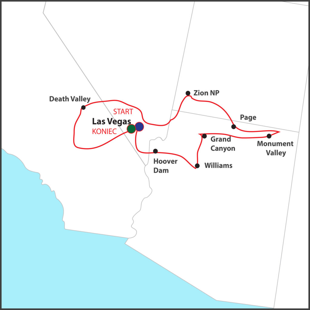 Zobaczymy to najciekawsze w Nevadzie, Arizonie i Utah. Podczas tej 7-Dniowej wycieczki odwiedzimy najpierw Las Vegas potem Dolinę Śmierci, Zion National Park. W Monument Valley spotkamy się z przewodnikiem ze szczepu Navajo, który zawiezie nas w najciekawsze miejsca doliny. W drodze do malowniczego jeziora Powell zatrzymamy się przy tamie Glen Canyon. Zobaczymy cudowny kanion Antylopy. W końcu dotrzemy do Grand Canyon. Dalej przejedziemy legendarna Drogą 66. Odwiedzimy Tamę Hoovera i na końcu wycieczki dalej będziemy zaznajamiać się z atrakcjami Las Vegas.